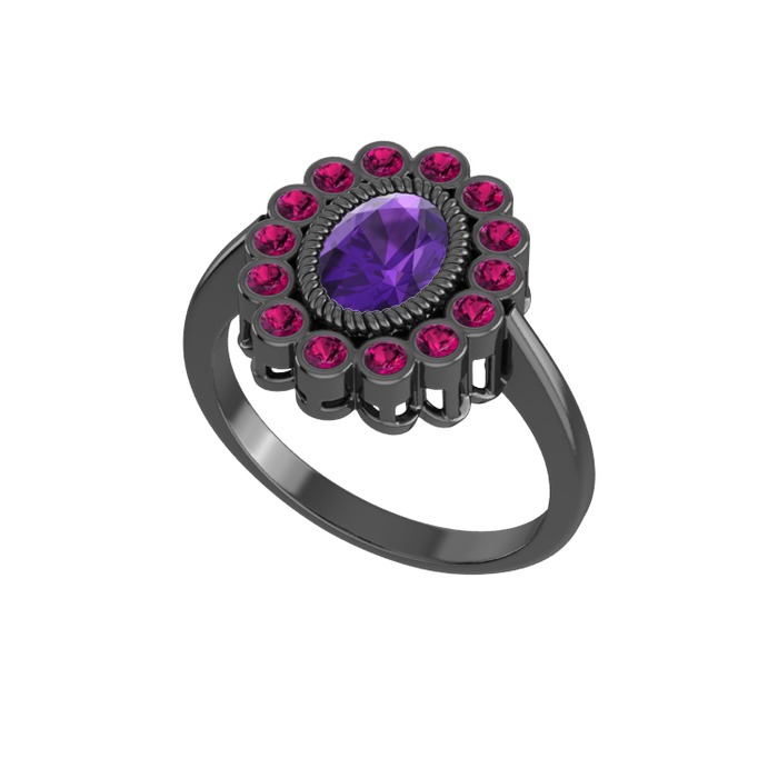 Ametist ve rodolit garnet 925 ayar siyah rodyum kaplama gümüş yüzük