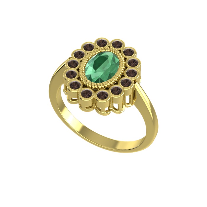 Kök zümrüt ve dumanlı kuvars 8 ayar altın yüzük