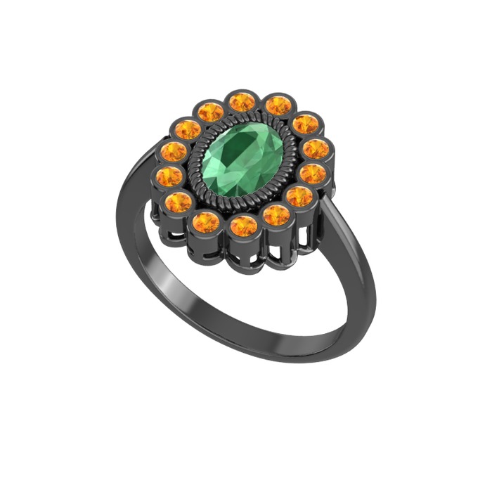 Kök zümrüt ve sitrin 925 ayar siyah rodyum kaplama gümüş yüzük