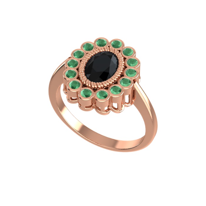 Siyah zirkon ve kök zümrüt 14 ayar rose altın yüzük