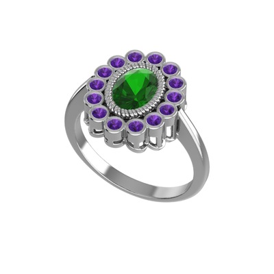 Yeşil kuvars ve ametist 18 ayar beyaz altın yüzük