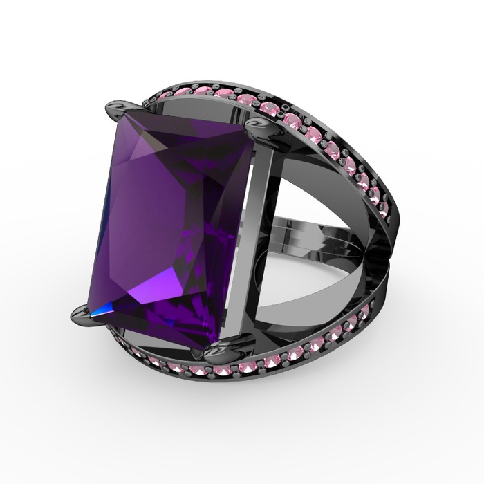 Ametist ve pembe kuvars 925 ayar siyah rodyum kaplama gümüş yüzük