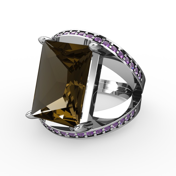 Dumanlı kuvars ve ametist 14 ayar beyaz altın yüzük