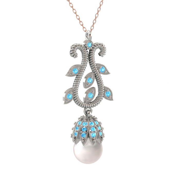 Inci ve akuamarin 8 ayar beyaz altın kolye (40 cm rose altın rolo zincir)
