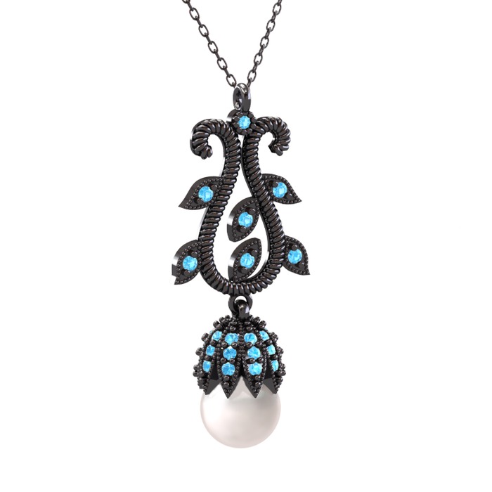 Inci ve akuamarin 925 ayar siyah rodyum kaplama gümüş kolye (40 cm gümüş rolo zincir)
