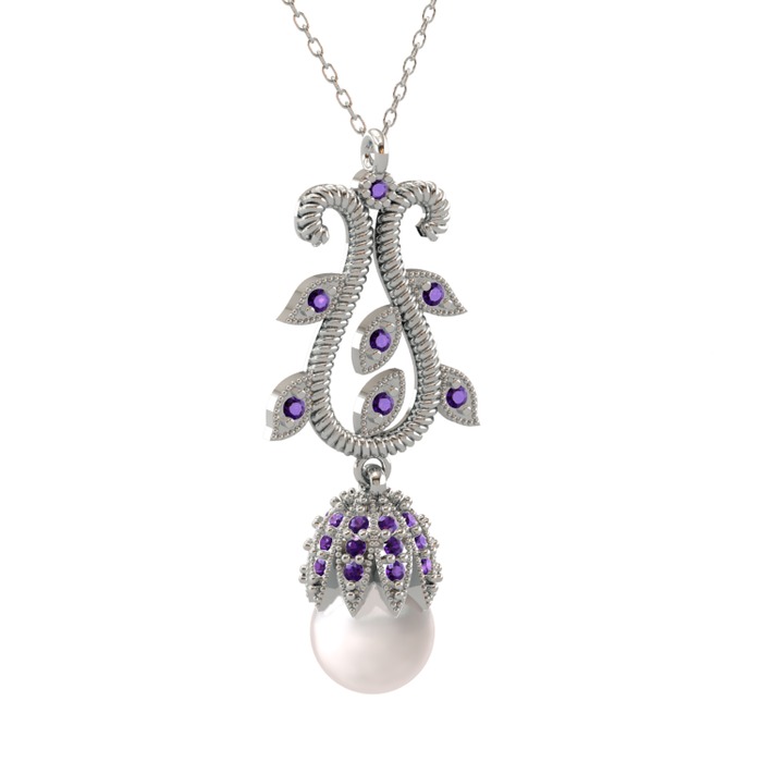 Inci ve ametist 18 ayar beyaz altın kolye (40 cm beyaz altın rolo zincir)