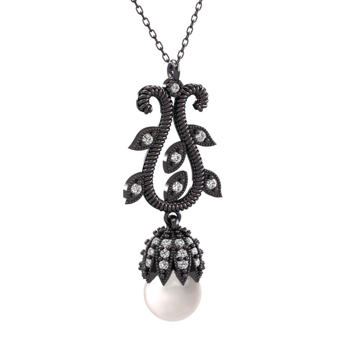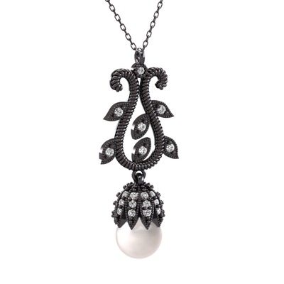 Inci ve beyaz zirkon 925 ayar siyah rodyum kaplama gümüş kolye (40 cm gümüş rolo zincir)