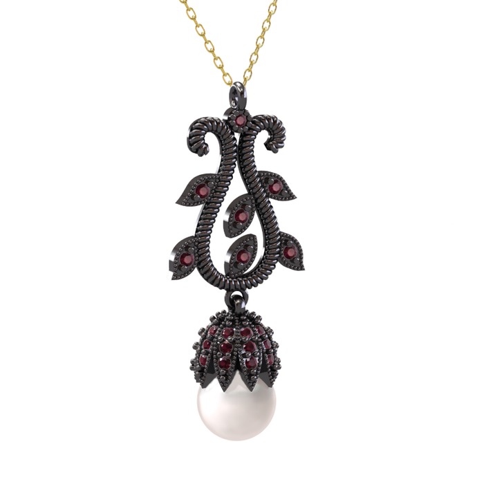 Inci ve kök yakut 925 ayar siyah rodyum kaplama gümüş kolye (40 cm altın rolo zincir)