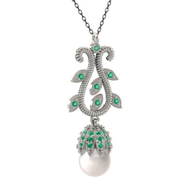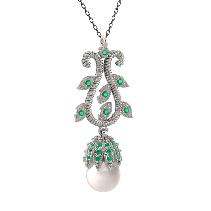 Inci ve kök zümrüt 18 ayar beyaz altın kolye (40 cm gümüş rolo zincir)