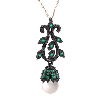 Inci ve kök zümrüt 925 ayar siyah rodyum kaplama gümüş kolye (40 cm gümüş rolo zincir)