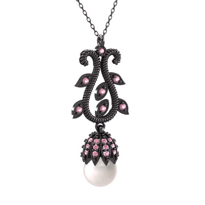 Inci ve pembe kuvars 925 ayar siyah rodyum kaplama gümüş kolye (40 cm gümüş rolo zincir)
