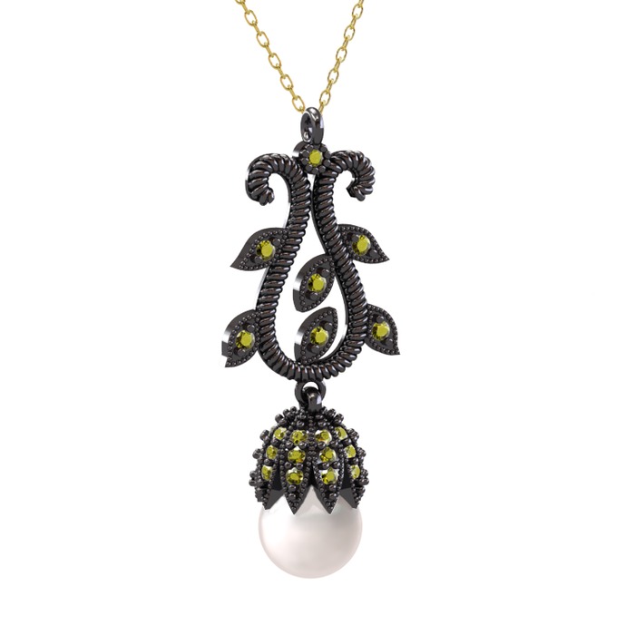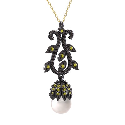 Inci ve peridot 925 ayar siyah rodyum kaplama gümüş kolye (40 cm gümüş rolo zincir)