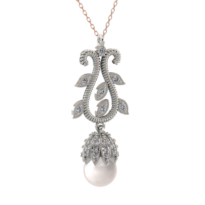 Inci ve pırlanta 18 ayar beyaz altın kolye (0.51 karat, 40 cm rose altın rolo zincir)