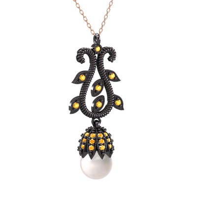 Şah İnci Kolye - Inci ve sitrin 925 ayar siyah rodyum kaplama gümüş kolye (40 cm rose altın rolo zincir)