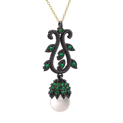 Inci ve yeşil kuvars 925 ayar siyah rodyum kaplama gümüş kolye (40 cm altın rolo zincir)