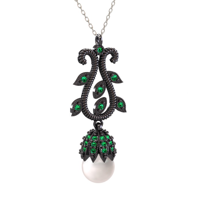 Şah İnci Kolye - Inci ve yeşil kuvars 925 ayar siyah rodyum kaplama gümüş kolye (40 cm beyaz altın rolo zincir)