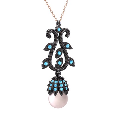 Pembe inci ve akuamarin 925 ayar siyah rodyum kaplama gümüş kolye (40 cm gümüş rolo zincir)