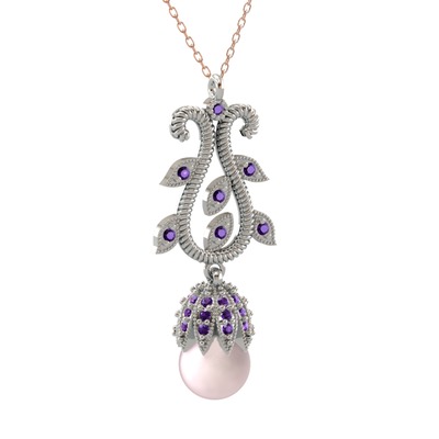 Pembe inci ve ametist 925 ayar gümüş kolye (40 cm rose altın rolo zincir)