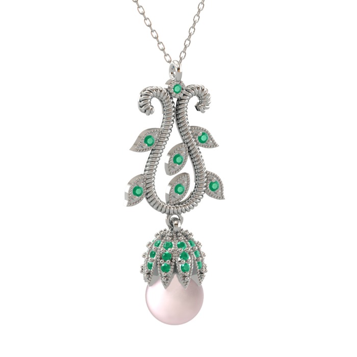 Pembe inci ve kök zümrüt 14 ayar beyaz altın kolye (40 cm beyaz altın rolo zincir)