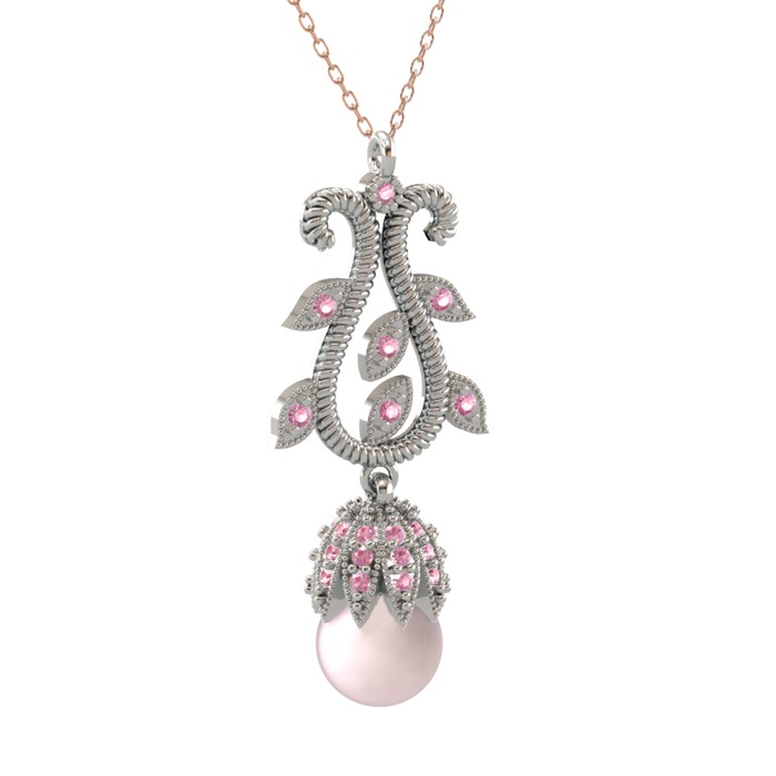 Pembe inci ve pembe kuvars 14 ayar beyaz altın kolye (40 cm gümüş rolo zincir)