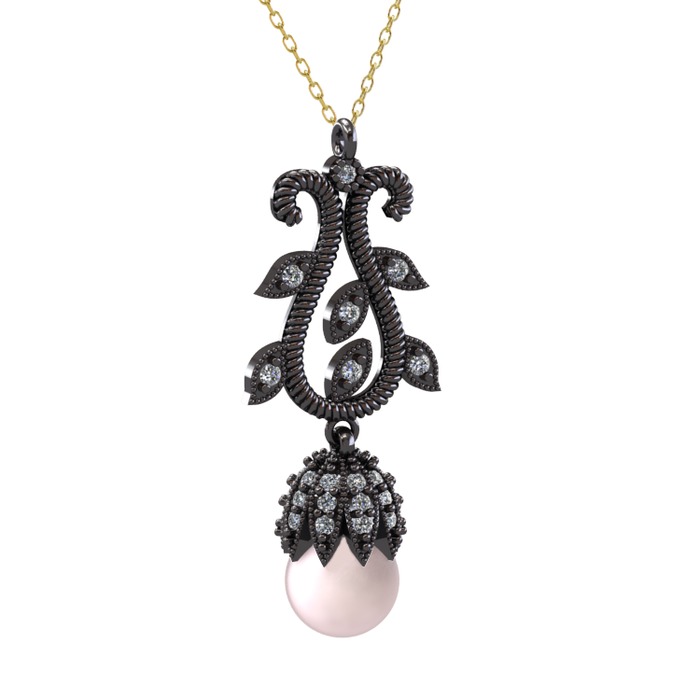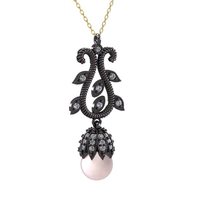 Pembe inci ve swarovski 925 ayar siyah rodyum kaplama gümüş kolye (40 cm altın rolo zincir)