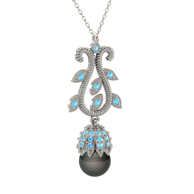 Siyah inci ve akuamarin 14 ayar beyaz altın kolye (40 cm beyaz altın rolo zincir)