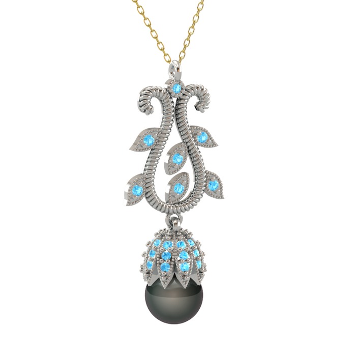 Siyah inci ve akuamarin 925 ayar gümüş kolye (40 cm altın rolo zincir)