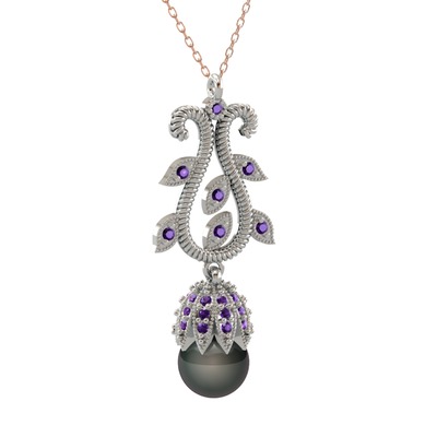 Siyah inci ve ametist 18 ayar beyaz altın kolye (40 cm rose altın rolo zincir)