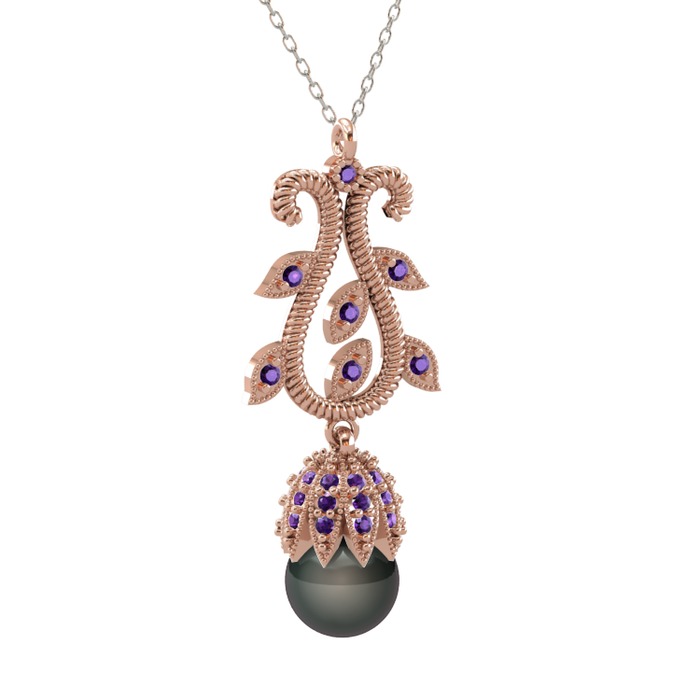 Siyah inci ve ametist 925 ayar rose altın kaplama gümüş kolye (40 cm beyaz altın rolo zincir)