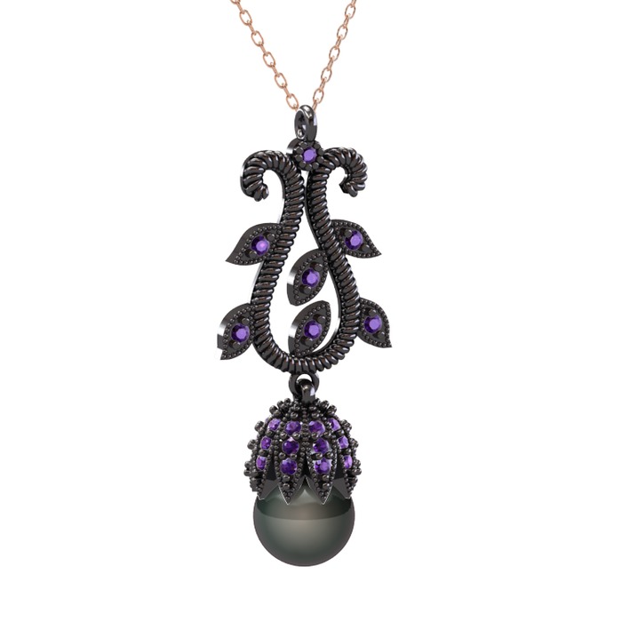 Siyah inci ve ametist 925 ayar siyah rodyum kaplama gümüş kolye (40 cm rose altın rolo zincir)