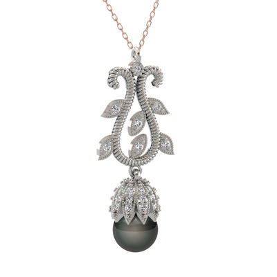 Siyah inci ve beyaz zirkon 14 ayar beyaz altın kolye (40 cm rose altın rolo zincir)