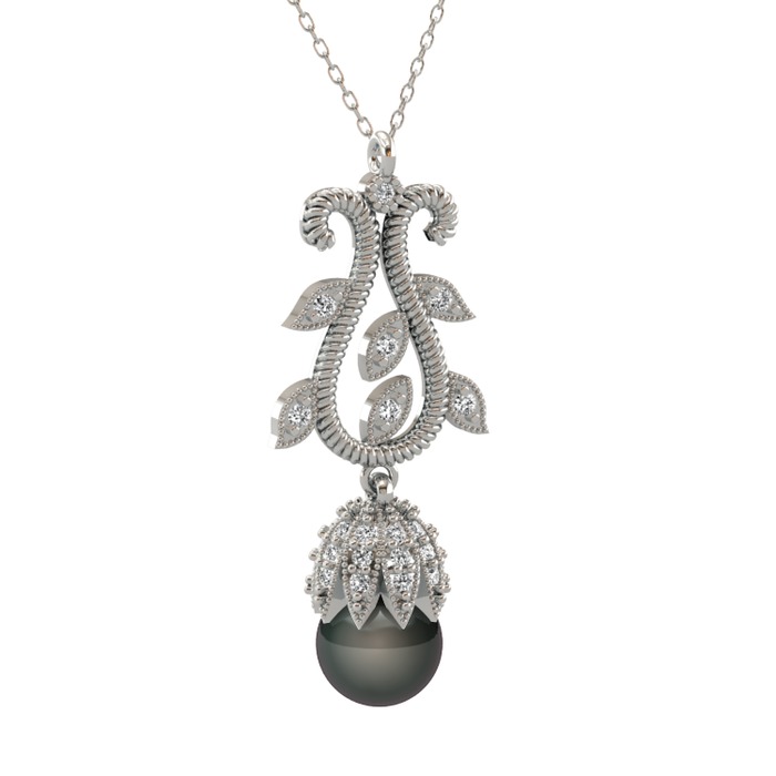 Siyah inci ve beyaz zirkon 8 ayar beyaz altın kolye (40 cm beyaz altın rolo zincir)