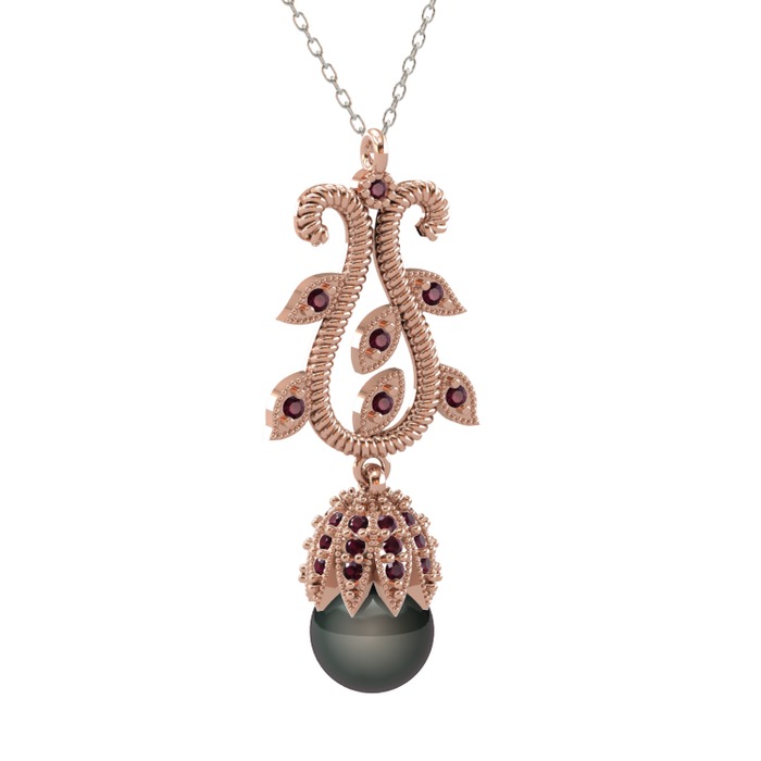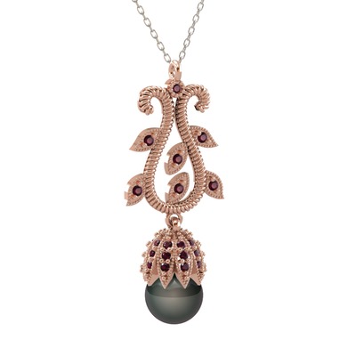 Siyah inci ve kök yakut 925 ayar rose altın kaplama gümüş kolye (40 cm beyaz altın rolo zincir)