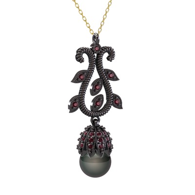 Siyah inci ve kök yakut 925 ayar siyah rodyum kaplama gümüş kolye (40 cm gümüş rolo zincir)