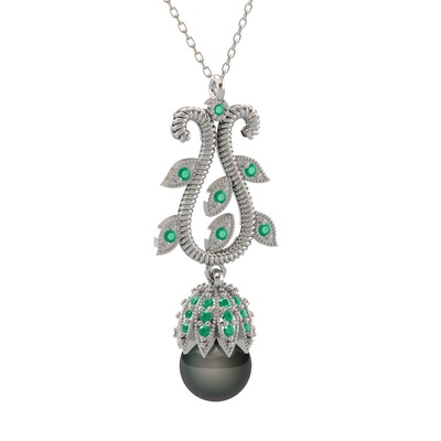 Siyah inci ve kök zümrüt 8 ayar beyaz altın kolye (40 cm gümüş rolo zincir)