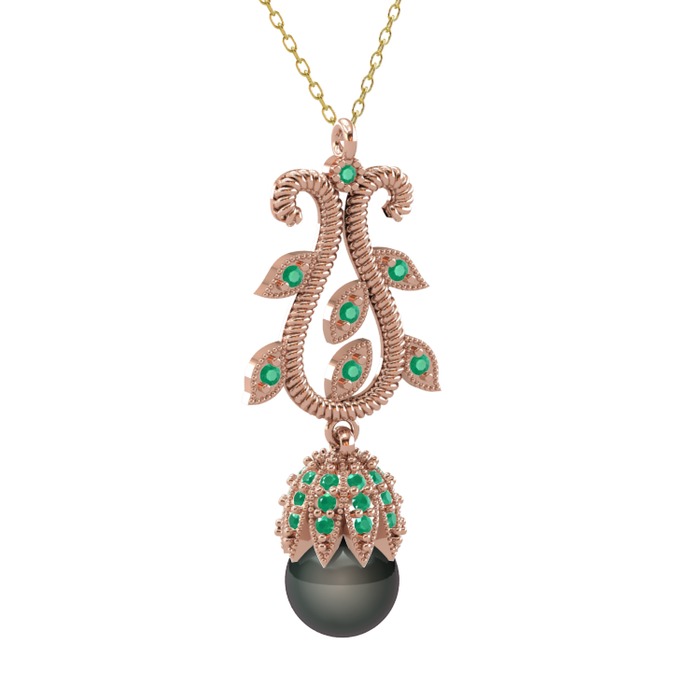 Siyah inci ve kök zümrüt 8 ayar rose altın kolye (40 cm altın rolo zincir)
