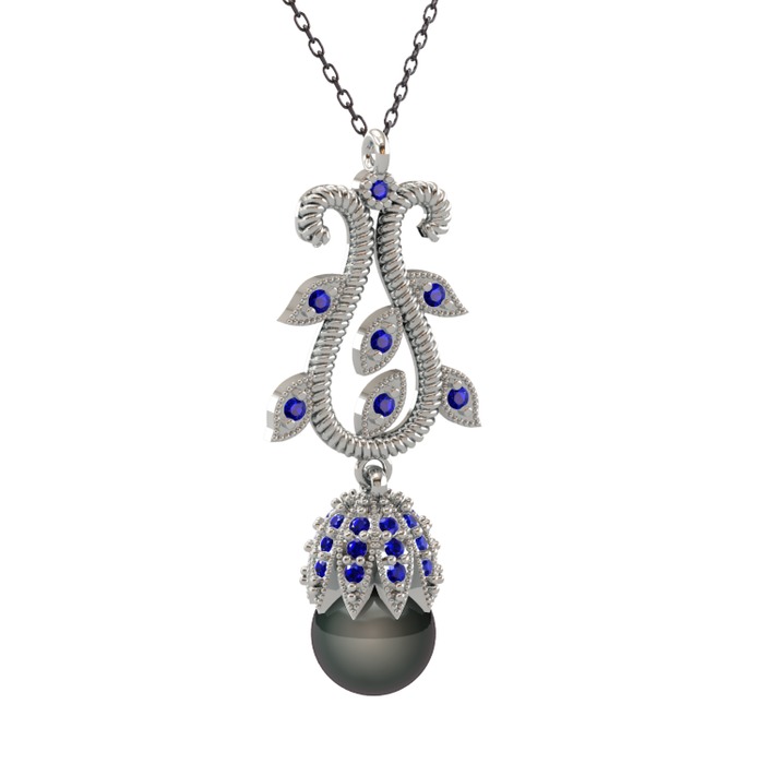 Siyah inci ve lab safir 14 ayar beyaz altın kolye (40 cm gümüş rolo zincir)