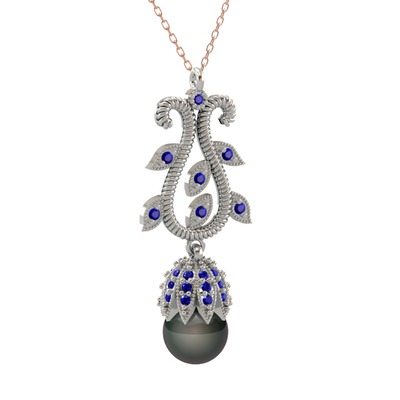 Siyah inci ve lab safir 925 ayar gümüş kolye (40 cm rose altın rolo zincir)