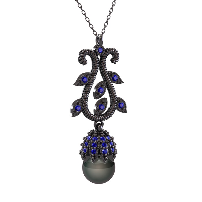 Siyah inci ve lab safir 925 ayar siyah rodyum kaplama gümüş kolye (40 cm gümüş rolo zincir)