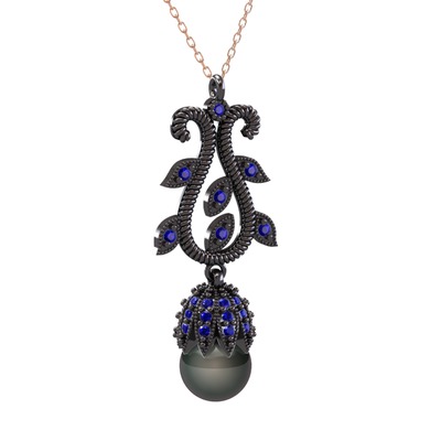 Siyah inci ve lab safir 925 ayar siyah rodyum kaplama gümüş kolye (40 cm rose altın rolo zincir)