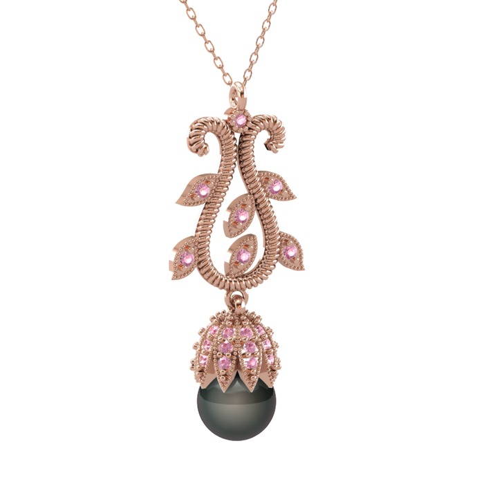 Siyah inci ve pembe kuvars 18 ayar rose altın kolye (40 cm rose altın rolo zincir)