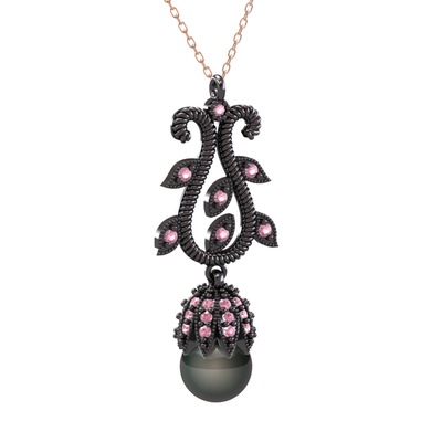 Siyah inci ve pembe kuvars 925 ayar siyah rodyum kaplama gümüş kolye (40 cm rose altın rolo zincir)