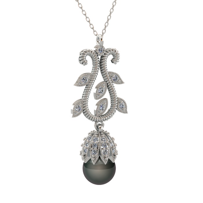 Siyah inci ve pırlanta 18 ayar beyaz altın kolye (0.51 karat, 40 cm beyaz altın rolo zincir)