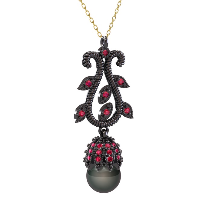 Siyah inci ve rodolit garnet 925 ayar siyah rodyum kaplama gümüş kolye (40 cm altın rolo zincir)