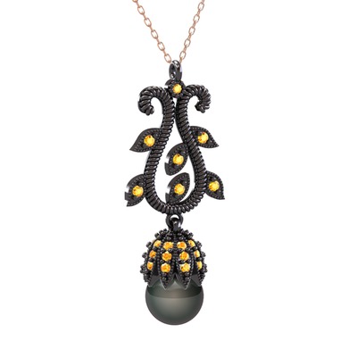 Siyah inci ve sitrin 925 ayar siyah rodyum kaplama gümüş kolye (40 cm gümüş rolo zincir)