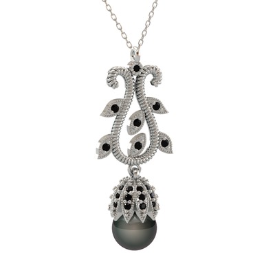 Siyah inci ve siyah zirkon 14 ayar beyaz altın kolye (40 cm beyaz altın rolo zincir)