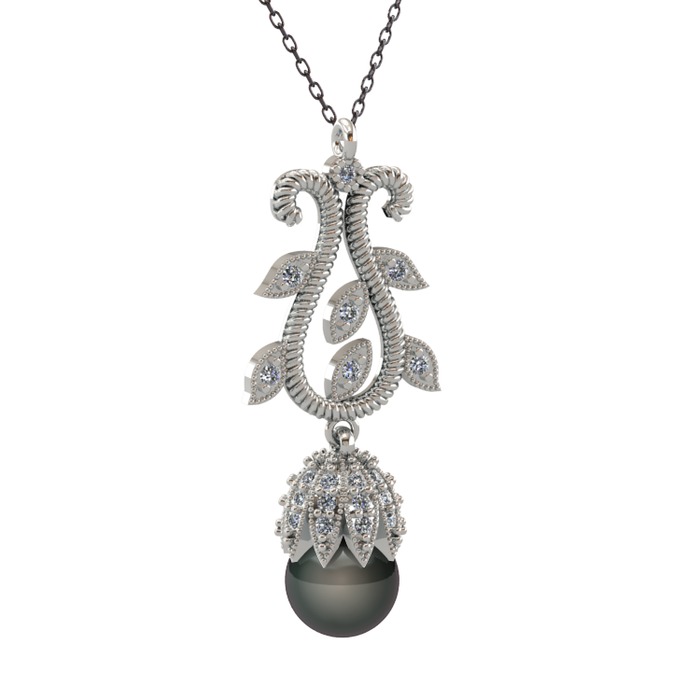 Siyah inci ve swarovski 14 ayar beyaz altın kolye (40 cm gümüş rolo zincir)