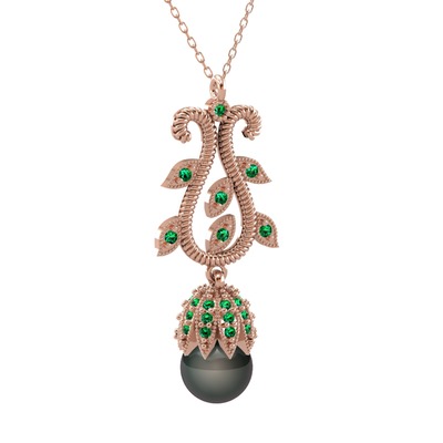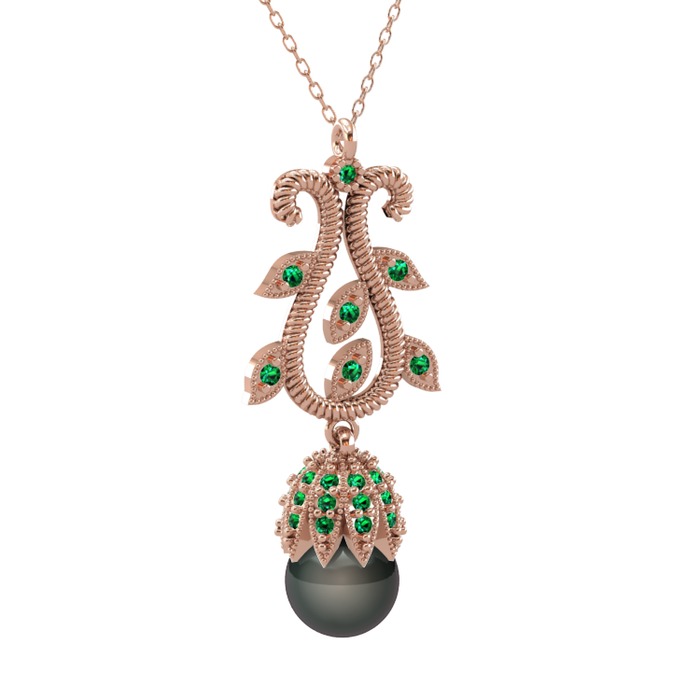 Siyah inci ve yeşil kuvars 14 ayar rose altın kolye (40 cm rose altın rolo zincir)