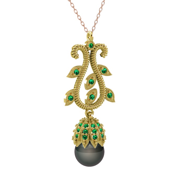 Siyah inci ve yeşil kuvars 18 ayar altın kolye (40 cm rose altın rolo zincir)