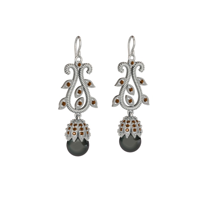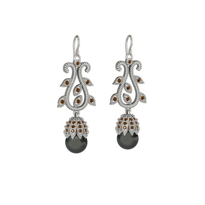 Siyah inci ve dumanlı kuvars 14 ayar beyaz altın küpe